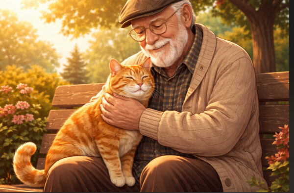 старий чоловік гладить рудого кота, а той тихо муркоче.
